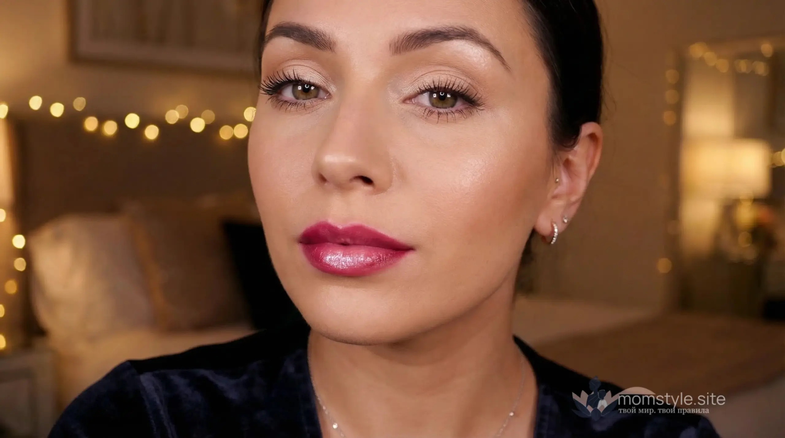 Вечерний образ (7 минут). Глубокий розово-малиновый или приглушённый красный + тщательная растушёвка + блеск с лёгким перламутром в центре. Тушь на ресницы, лёгкие тени. Результат — нарядно, но не перегружено.