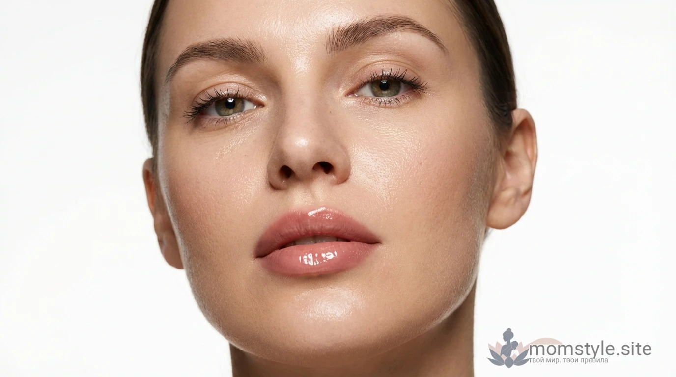Шаг 5 (30 сек) — Glazed финиш: нанеси прозрачный или слегка тонированный глосс/бальзам только в центральную зону губ. Не размазывай до краёв — блеск должен создать «стеклянный» акцент, а не растечься по всей поверхности